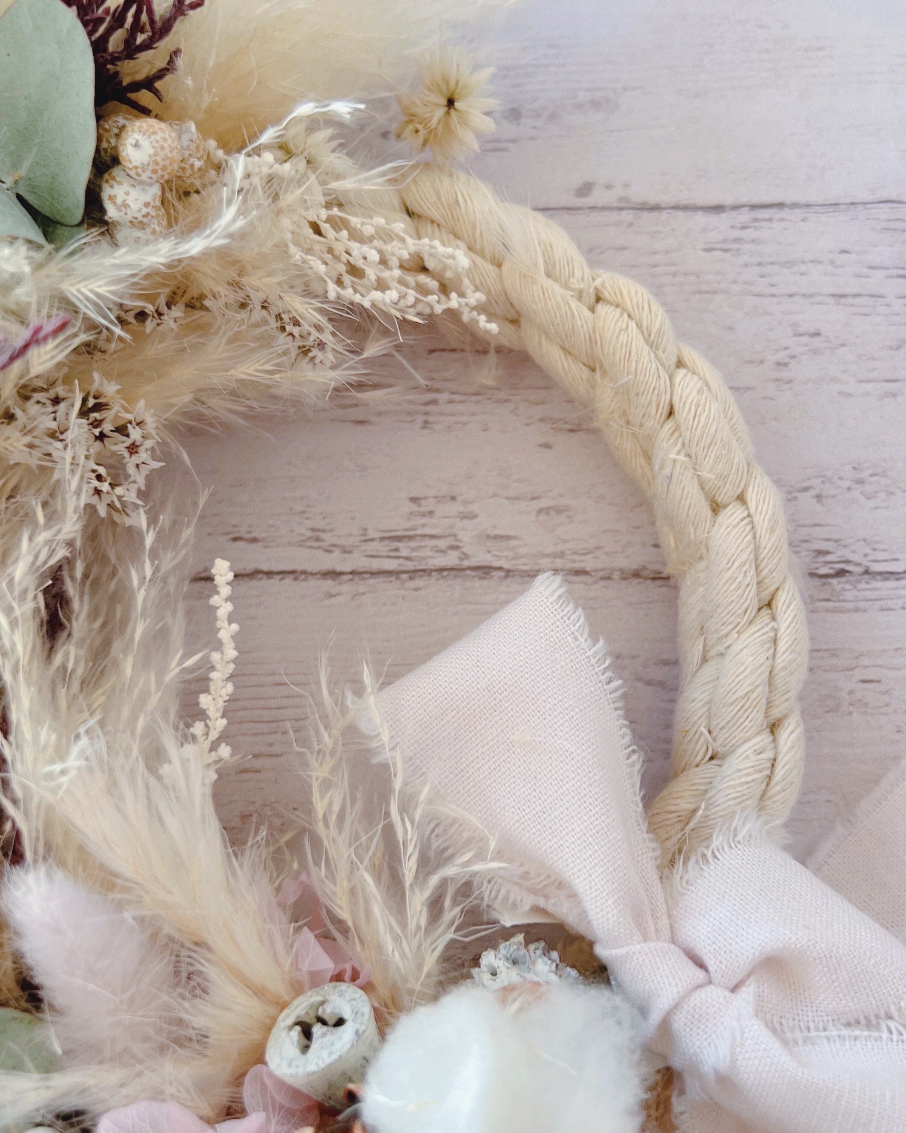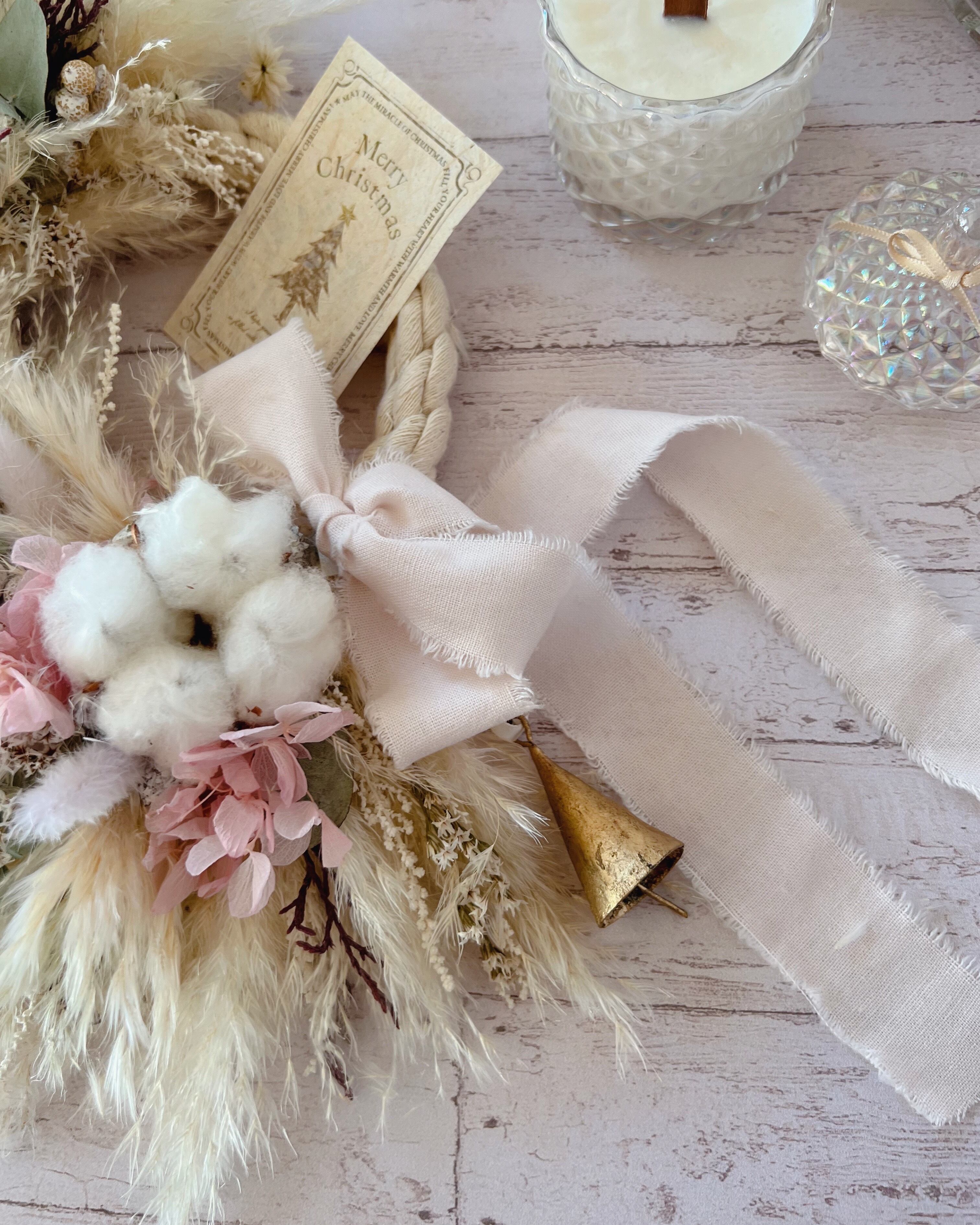 ふわふわ降り積もる雪の妖精の様なリースに仕上げました。こちらは淡いピンクバージョンになります。